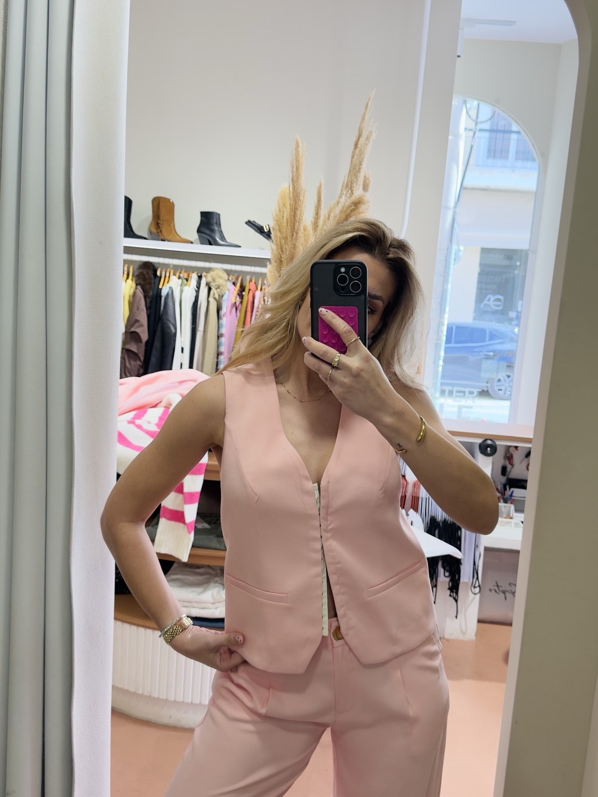 Σε απαλό blush ροζ, με βαθύ V ντεκολτέ και καθαρές minimal γραμμές, αγκαλιάζει το σώμα και χαρίζει κομψό, θηλυκό αποτέλεσμα. Κλείνει μπροστά και διαθέτει διακριτικές τσέπες, ενώ η εφαρμογή του είναι ιδανική είτε φορεθεί μόνο του είτε σε σετ με το αντίστοιχο wide leg παντελόνι.