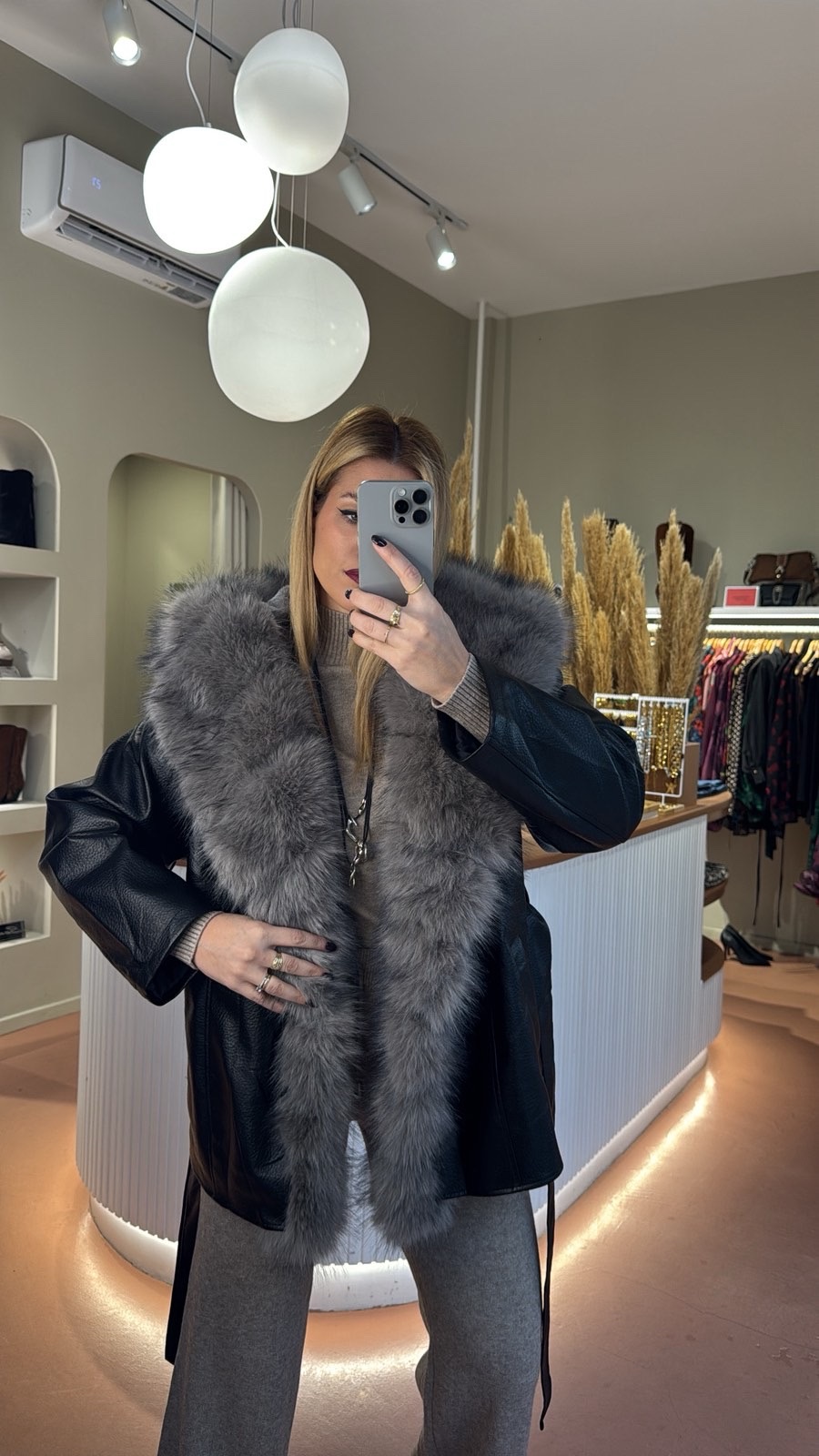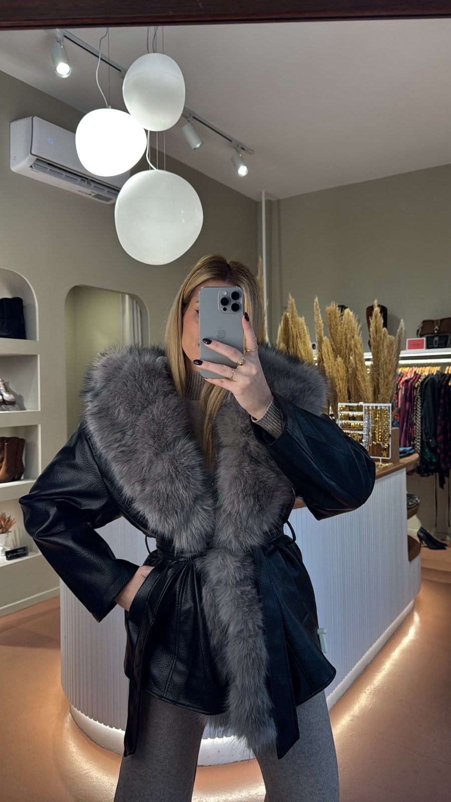 Statement δερματίνη με large faux-fur γιακά και tie-belt μέση για πιο θηλυκή γραμμή. Ζεστό, εντυπωσιακό και super chic για city winter εμφανίσεις. Το faux fur δημιουργεί πολυτελή υφή και frame στο πρόσωπο, ενώ η ζώνη σμιλεύει το σώμα. Διαθέτει και κουκούλα