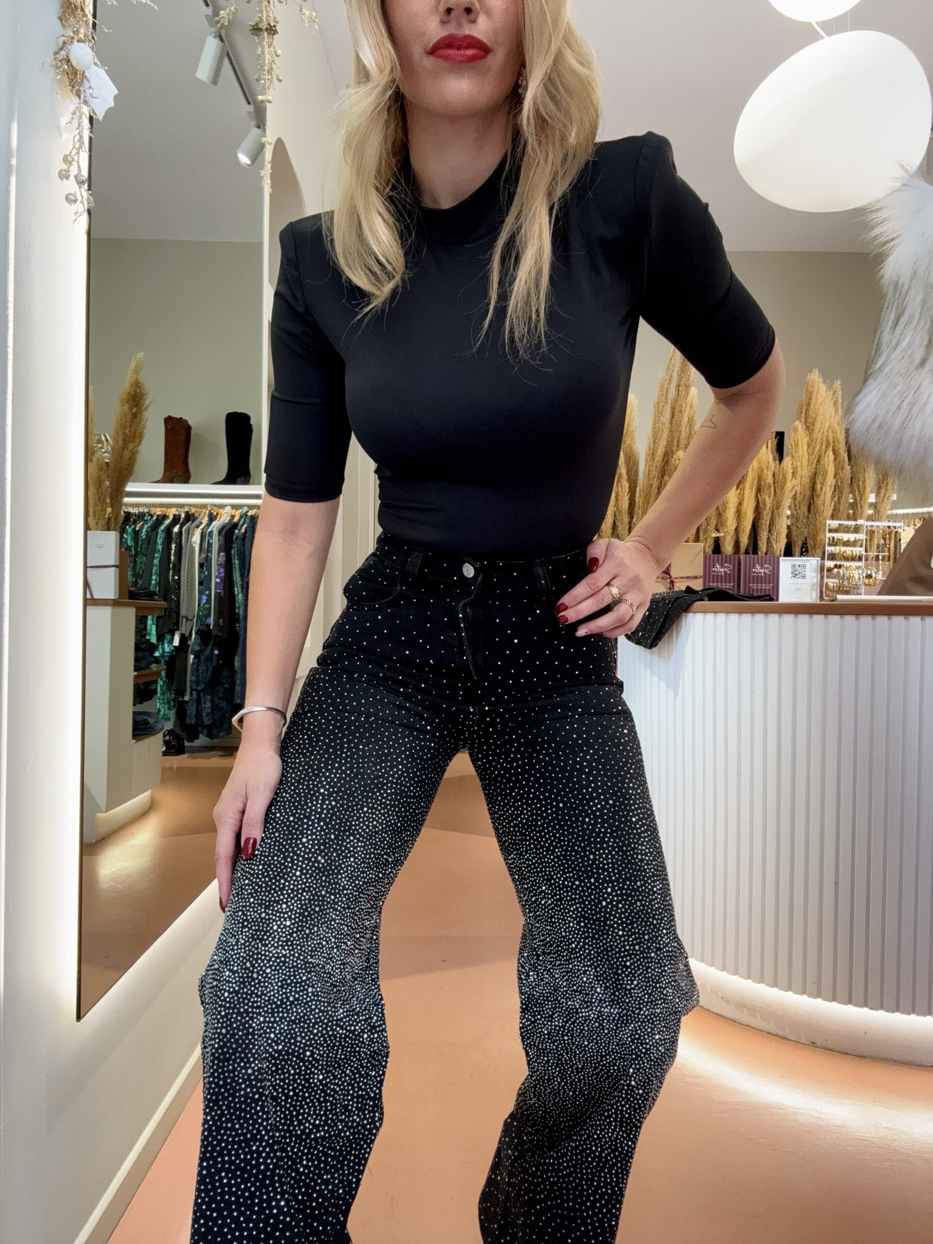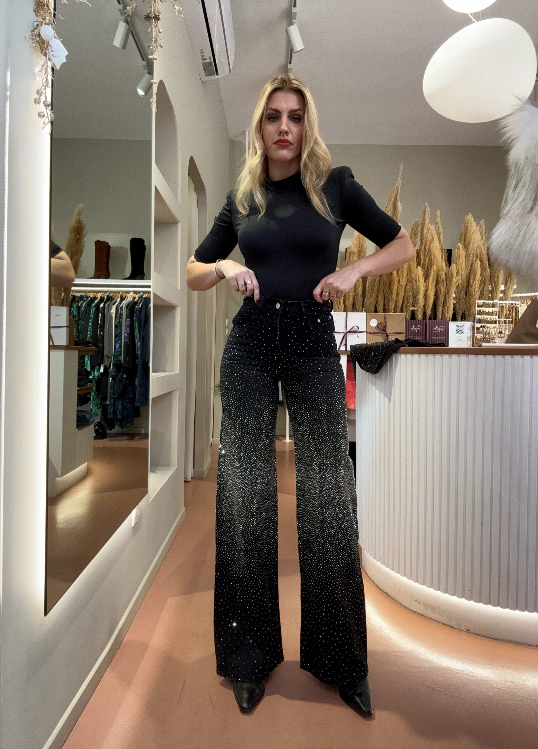 Τα Galaxy Glow Black Jeans είναι το απόλυτο statement κομμάτι για εμφανίσεις που δεν περνούν απαρατήρητες. Μαύρο denim διακοσμημένο με διακριτικές, λαμπερές πέτρες που δημιουργούν ένα εφέ νυχτερινού ουρανού, χαρίζοντας λάμψη σε κάθε σου κίνηση.