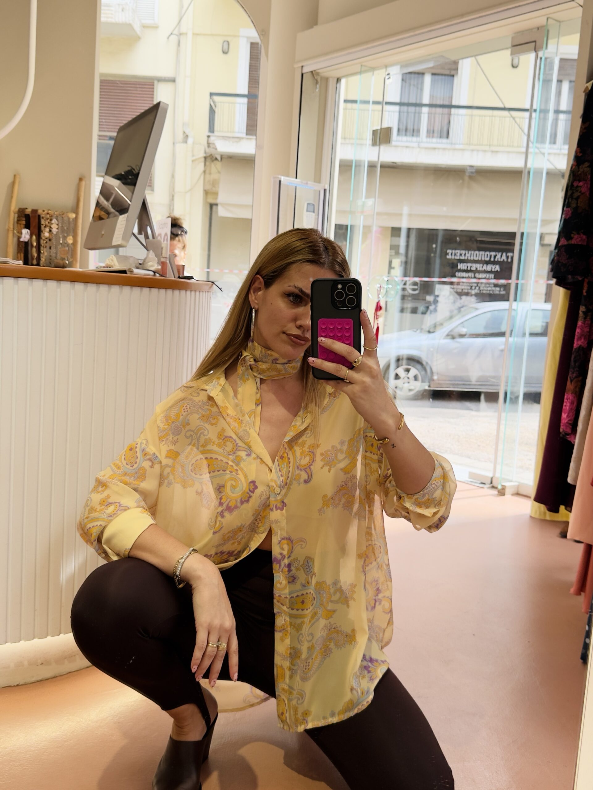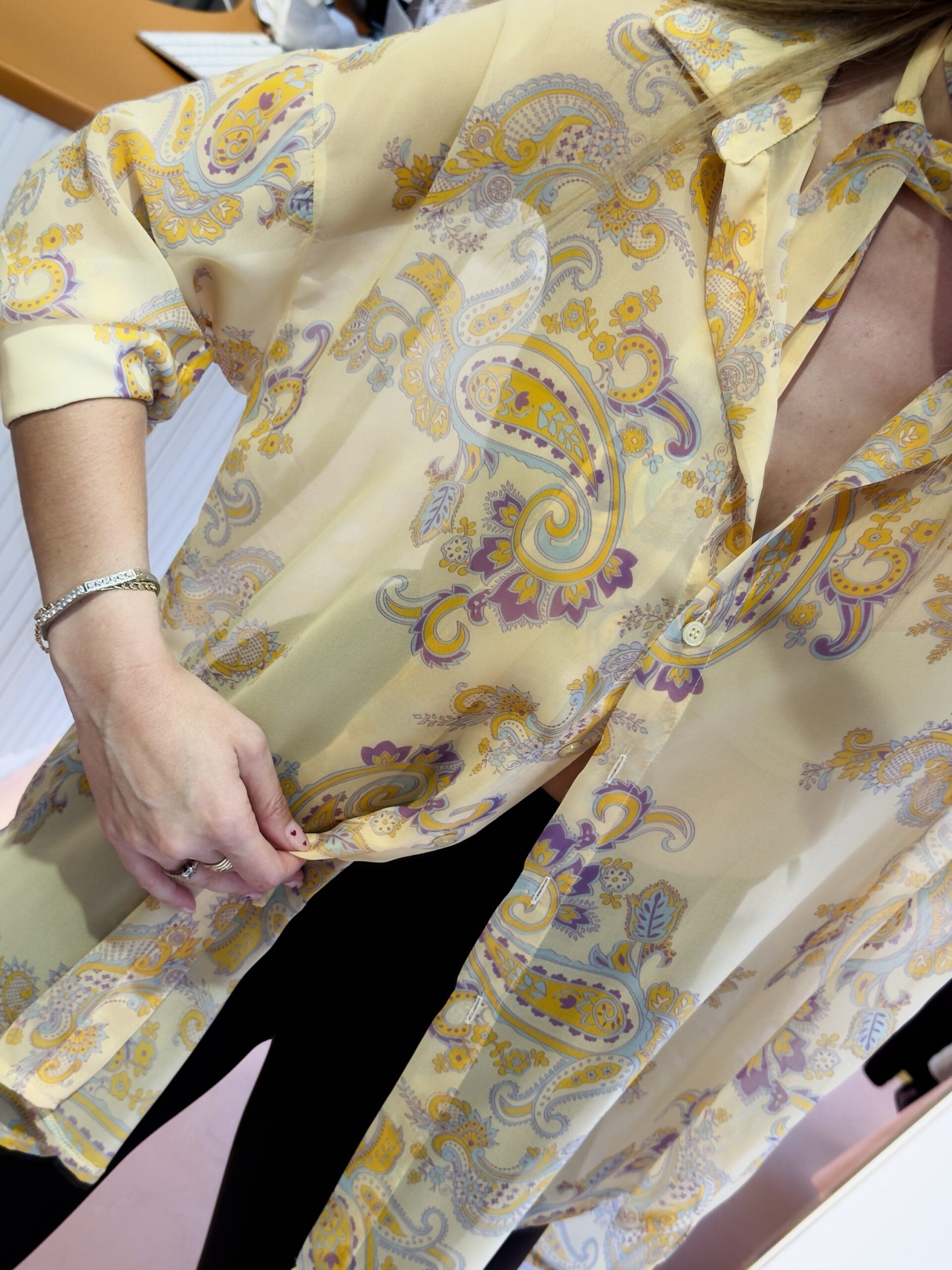 Αέρινη, ημιδιάφανη ζορζέτα με boho paisley μοτίβο σε ζεστές χρυσοκίτρινες αποχρώσεις.