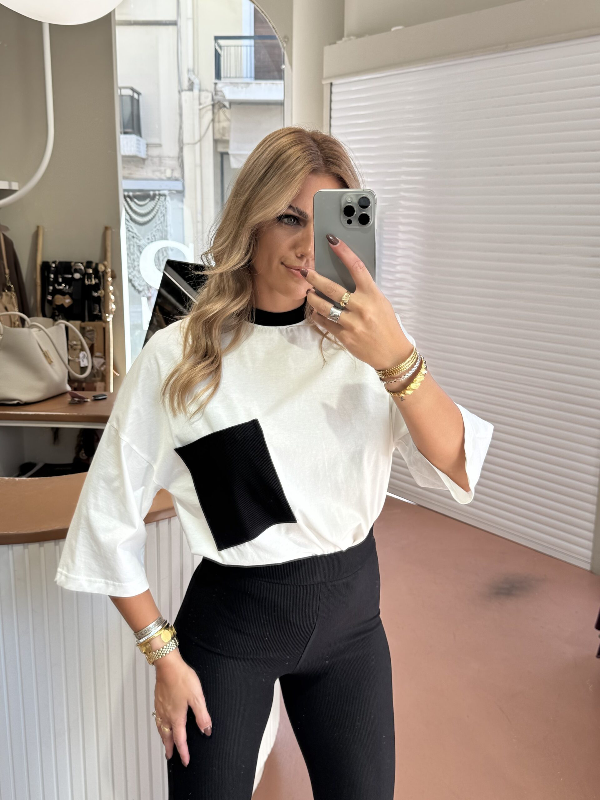 Το T-shirt είναι one size, κατασκευασμένο από βαμβάκι, με ριπ τσέπη και ριπ γιακά για μοντέρνα λεπτομέρεια.
