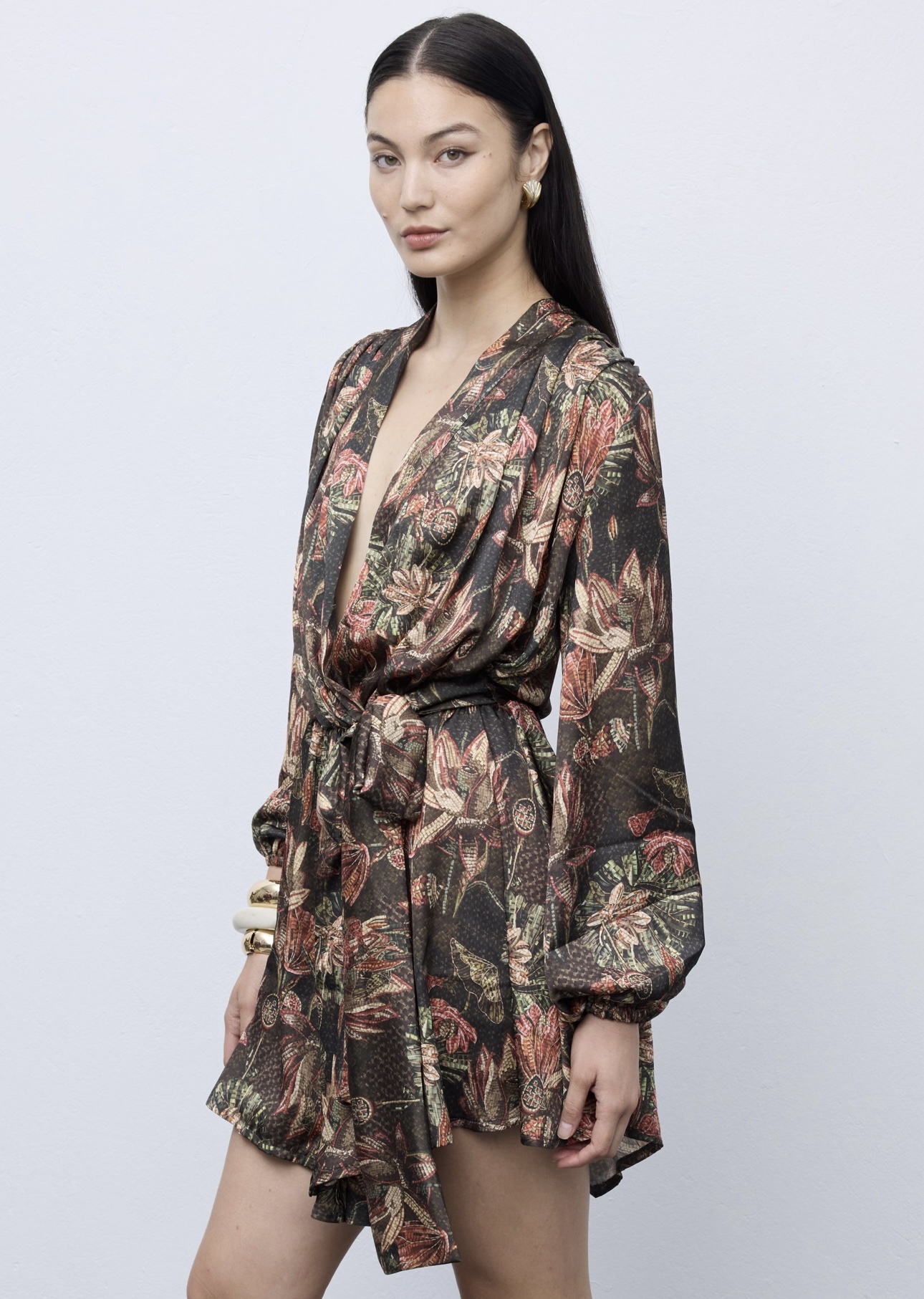 Το Butterfly Mosaic Wrap Mini Dress επαναπροσδιορίζει τη σύγχρονη κομψότητα μέσα από το εντυπωσιακό του print και τη ρευστή, κολακευτική γραμμή του. Κατασκευασμένο από ελαφρύ ύφασμα που πέφτει όμορφα, διαθέτει κρουαζέ σχέδιο στο μπροστινό μέρος και φαρδιά statement μανίκια, συνδυάζοντας τη δυναμικότητα με την εκλεπτυσμένη άνεση.