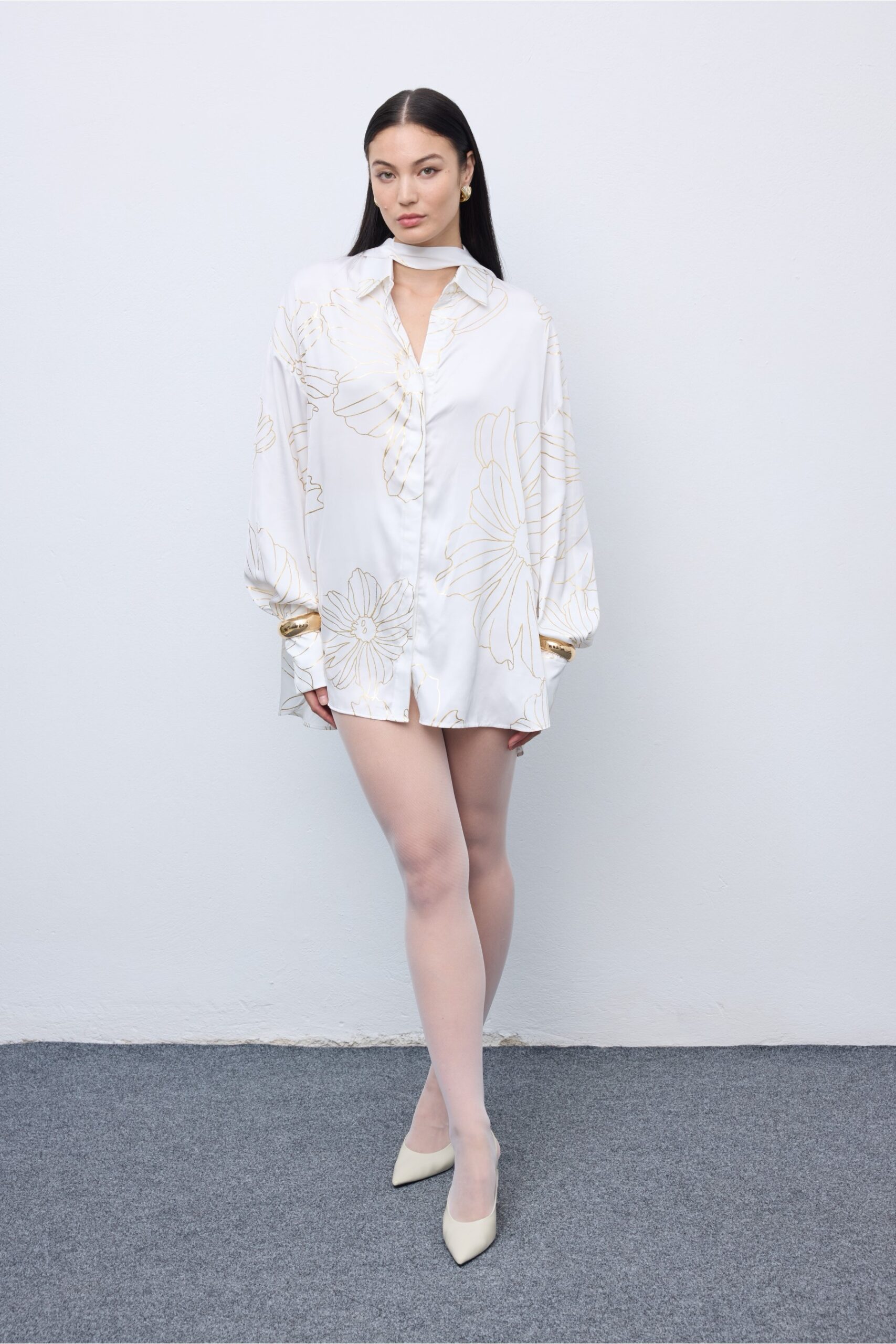 Αναβάθμισε τη γκαρνταρόμπα σου με αυτό το oversized πουκάμισο, που αποπνέει αβίαστη κομψότητα και μοντέρνο χαρακτήρα. Διαθέτει εντυπωσιακό floral line print, ενώ είναι κατασκευασμένο από ελαφρύ, μεταξένιο ύφασμα που αγκαλιάζει απαλά το σώμα, δημιουργώντας μια χαλαρή αλλά εκλεπτυσμένη σιλουέτα.