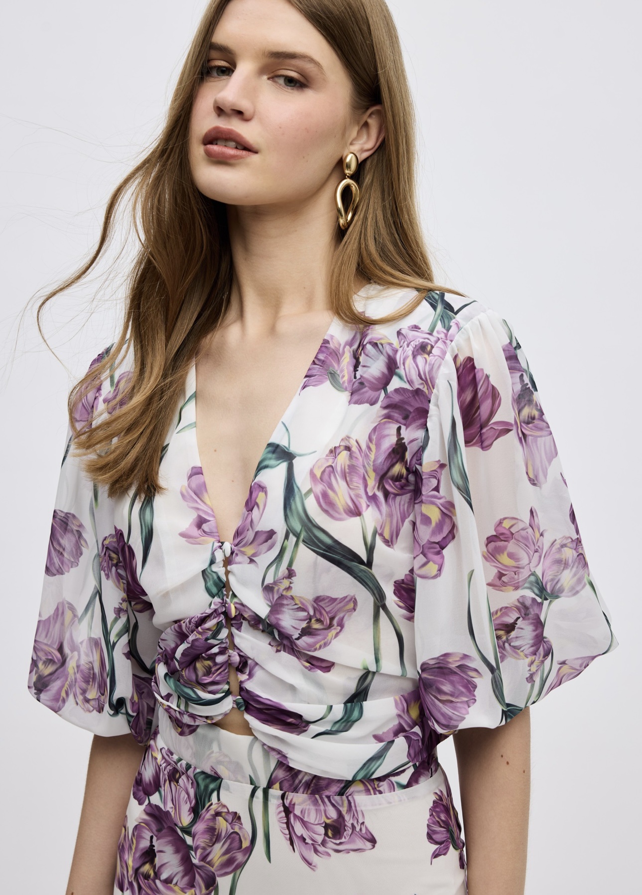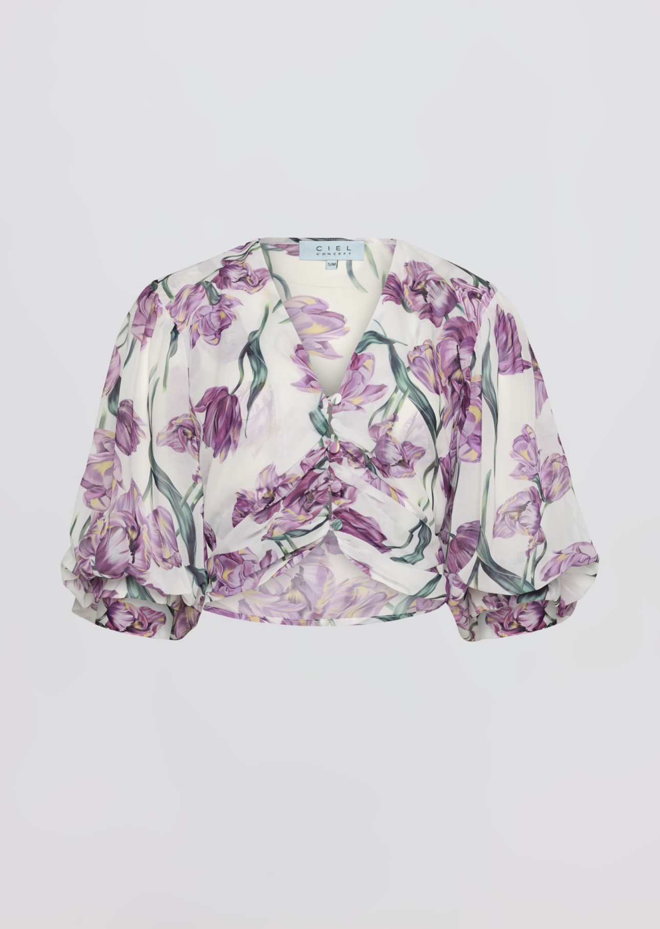 Κρουαζέ top με εντυπωσιακό floral print εμπνευσμένο από τουλίπες σε αποχρώσεις μωβ και πράσινου, που αποπνέει ρομαντισμό και θηλυκότητα. Η ελαφριά, αέρινη υφή του υφάσματος χαρίζει κίνηση και κομψότητα, ενώ το δέσιμο μπροστά τονίζει τη μέση και αναδεικνύει τη σιλουέτα.