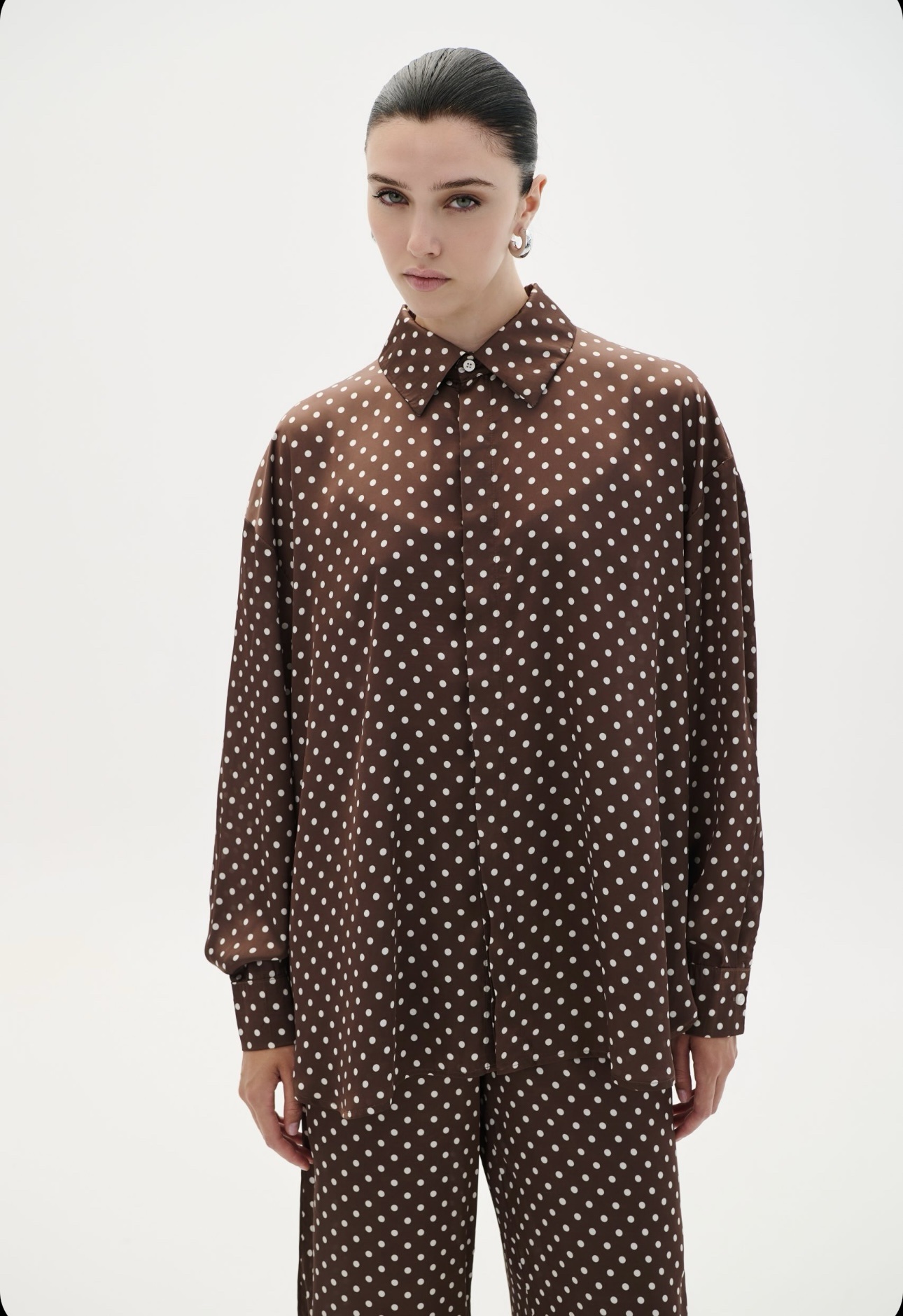 Σατέν πουκάμισο με πουά μοτίβο σε σοκολατί απόχρωση και λευκές κουκκίδες — ένα κομμάτι που συνδυάζει θηλυκότητα και διαχρονική κομψότητα. Διαθέτει γιακά, κουμπιά μπροστά και χαλαρή εφαρμογή One Size, ιδανική για κάθε σωματότυπο. Το απαλό σατέν ύφασμα χαρίζει πολυτελή υφή και κίνηση.