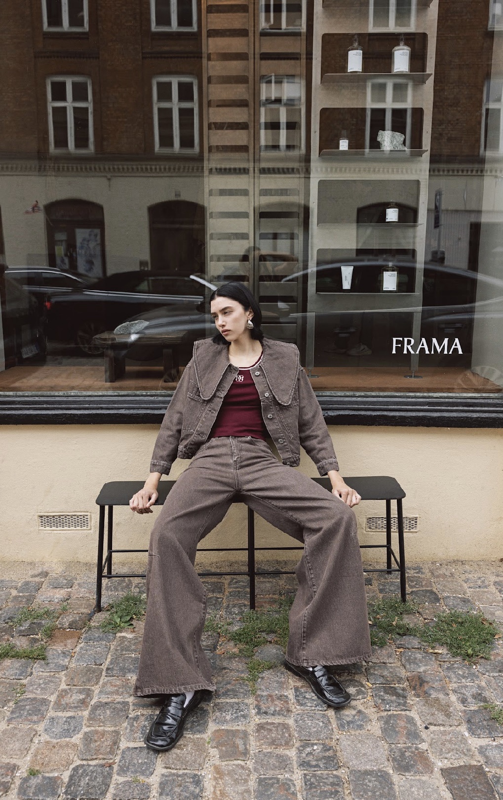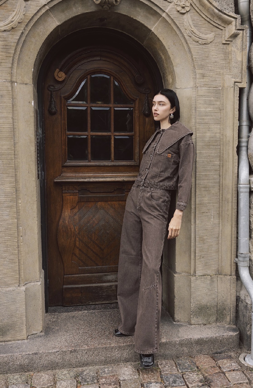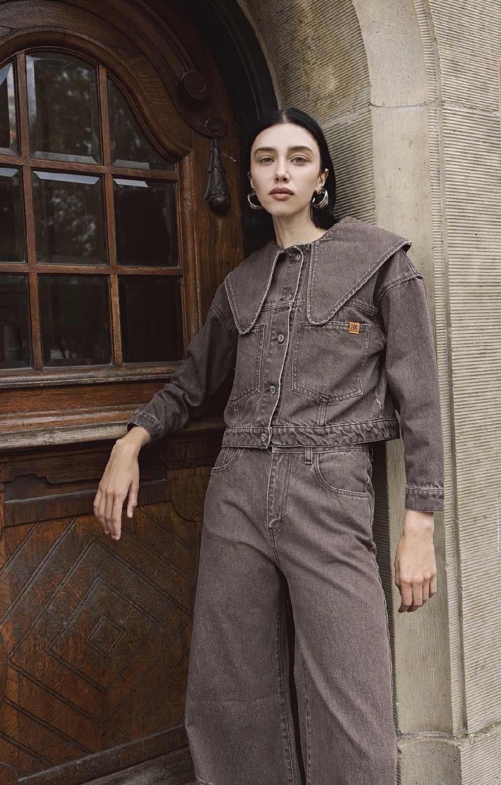 Denim cropped jacket σε γήινη καφέ απόχρωση, φτιαγμένο από 100% βαμβάκι. Διαθέτει χαρακτηριστικό μεγάλο γιακά, μπροστινά κουμπιά και τσέπες, συνδυάζοντας vintage αισθητική με μοντέρνο χαρακτήρα. Το λάστιχο στη μέση χαρίζει άψογη εφαρμογή και θηλυκή σιλουέτα.