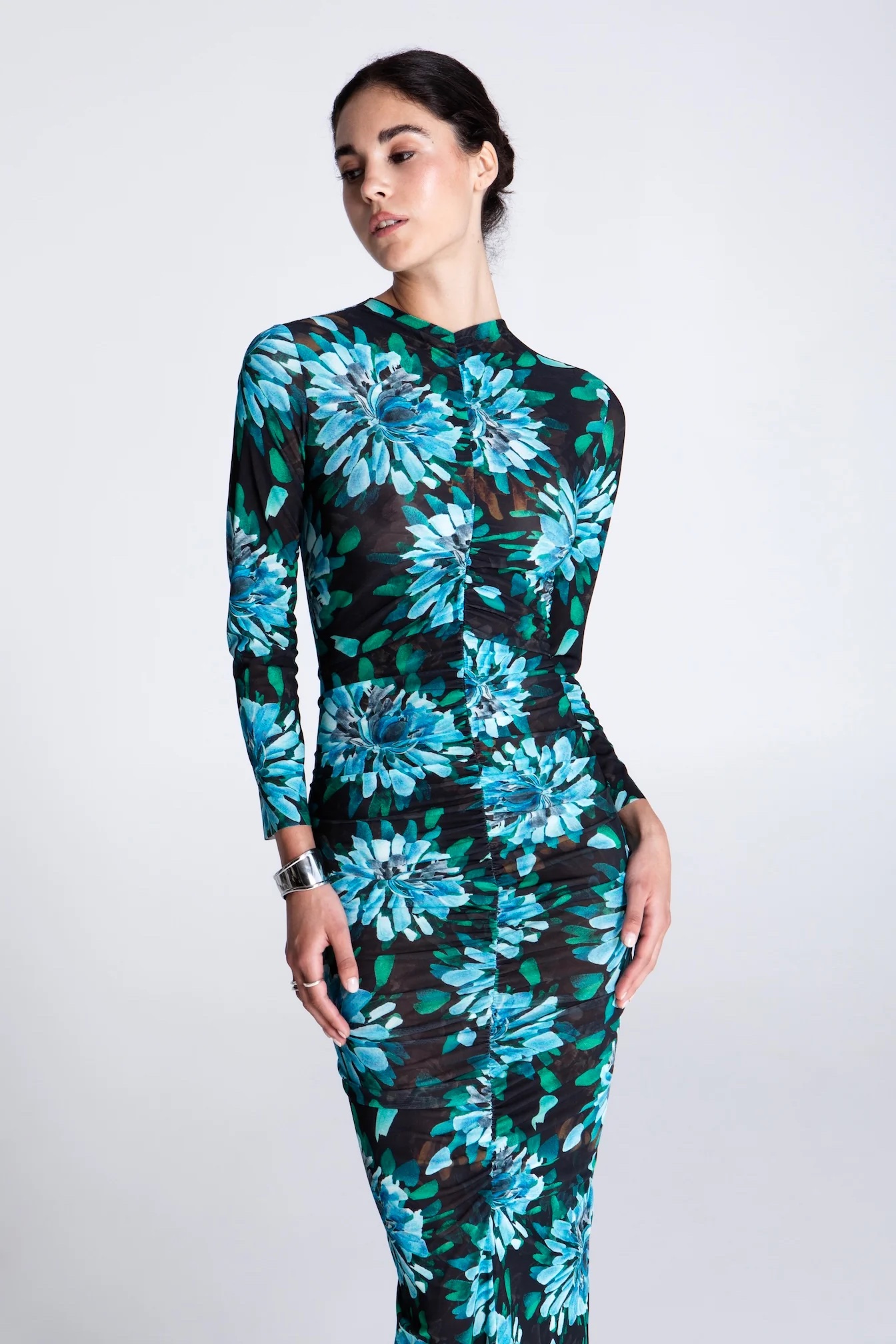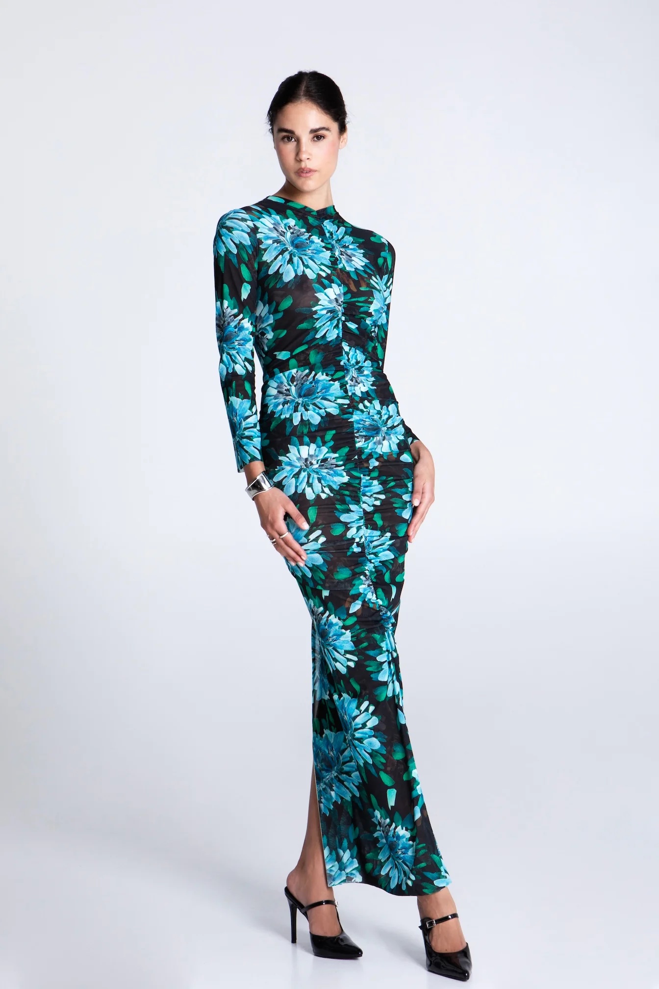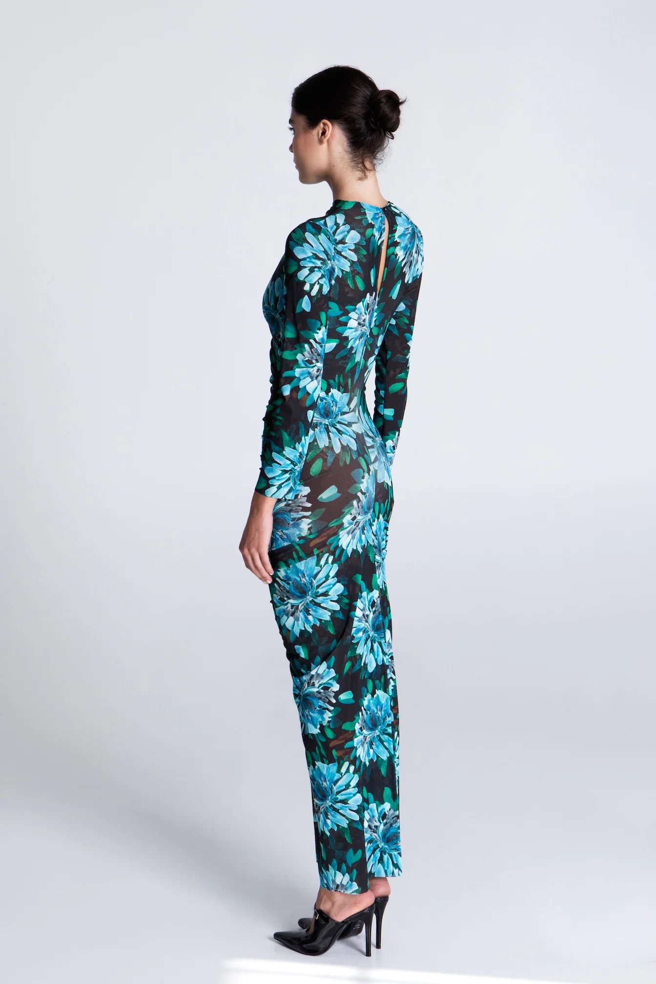 Μακρύ φόρεμα με εφαρμοστή γραμμή και floral μοτίβο σε αποχρώσεις του μπλε και του πράσινου πάνω σε σκούρα βάση.