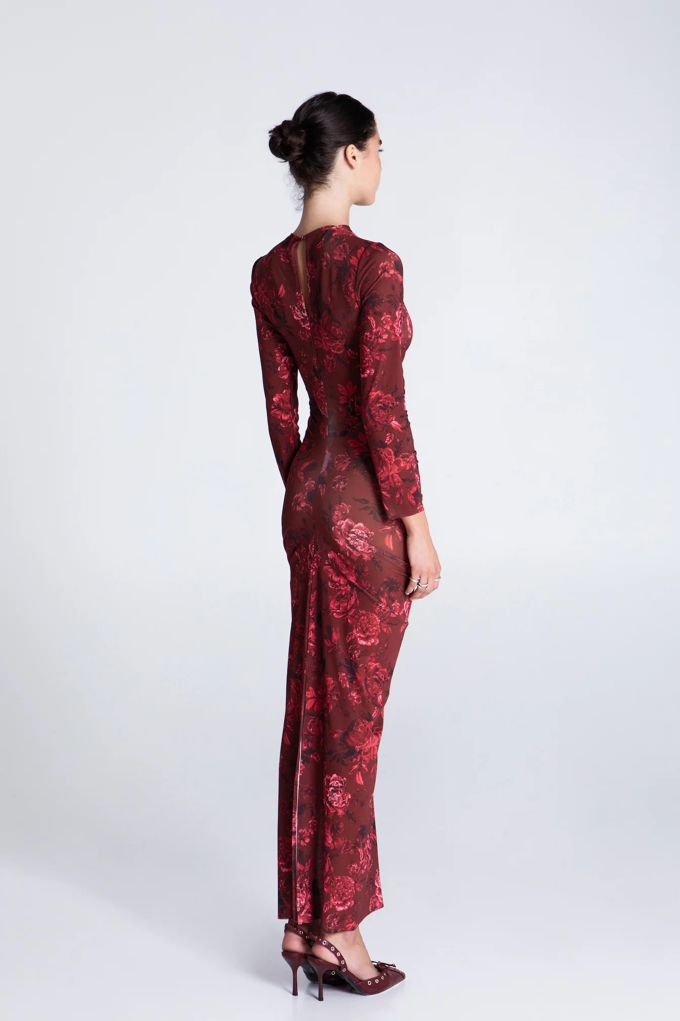 Maxi φόρεμα σε μπορντό απόχρωση με εντυπωσιακό ρομαντικό hand-painted print. Η εφαρμογή του αγκαλιάζει το σώμα και το κεντρικό σούρωμα αναδεικνύει τη σιλουέτα με εκλεπτυσμένη θηλυκότητα, ενώ το ελαστικό ύφασμα χαρίζει άνεση και κίνηση.