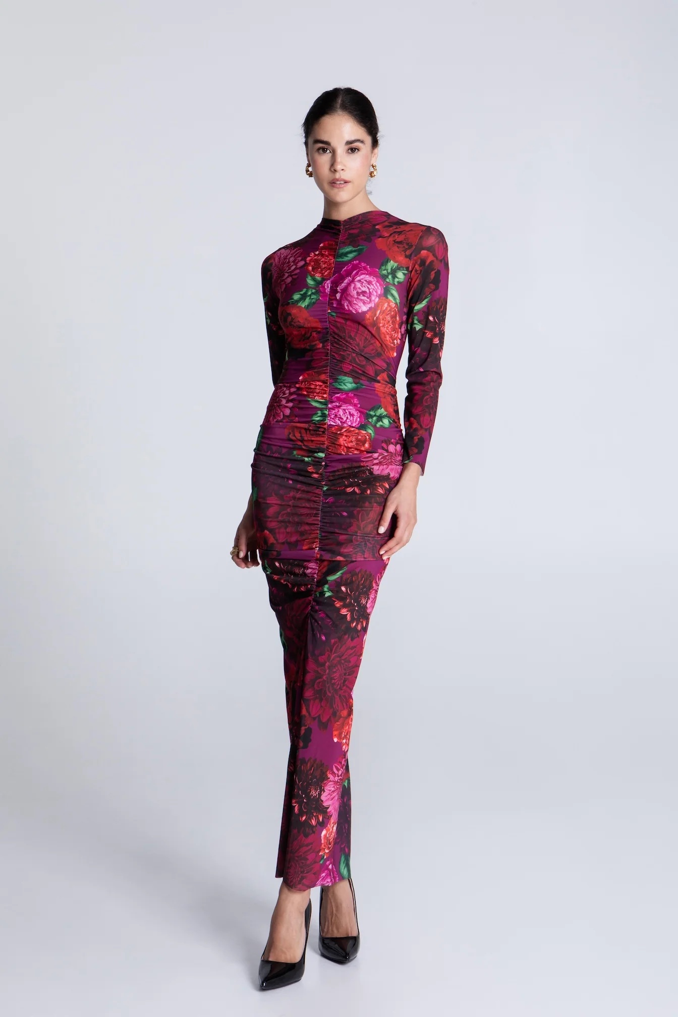 Maxi φόρεμα σε κόκκινη απόχρωση με εντυπωσιακό ρομαντικό hand-painted print. Η εφαρμογή του αγκαλιάζει το σώμα και το κεντρικό σούρωμα αναδεικνύει τη σιλουέτα με εκλεπτυσμένη θηλυκότητα, ενώ το ελαστικό ύφασμα χαρίζει άνεση και κίνηση.