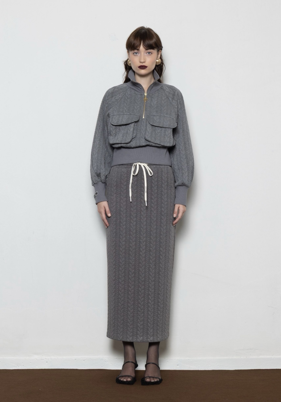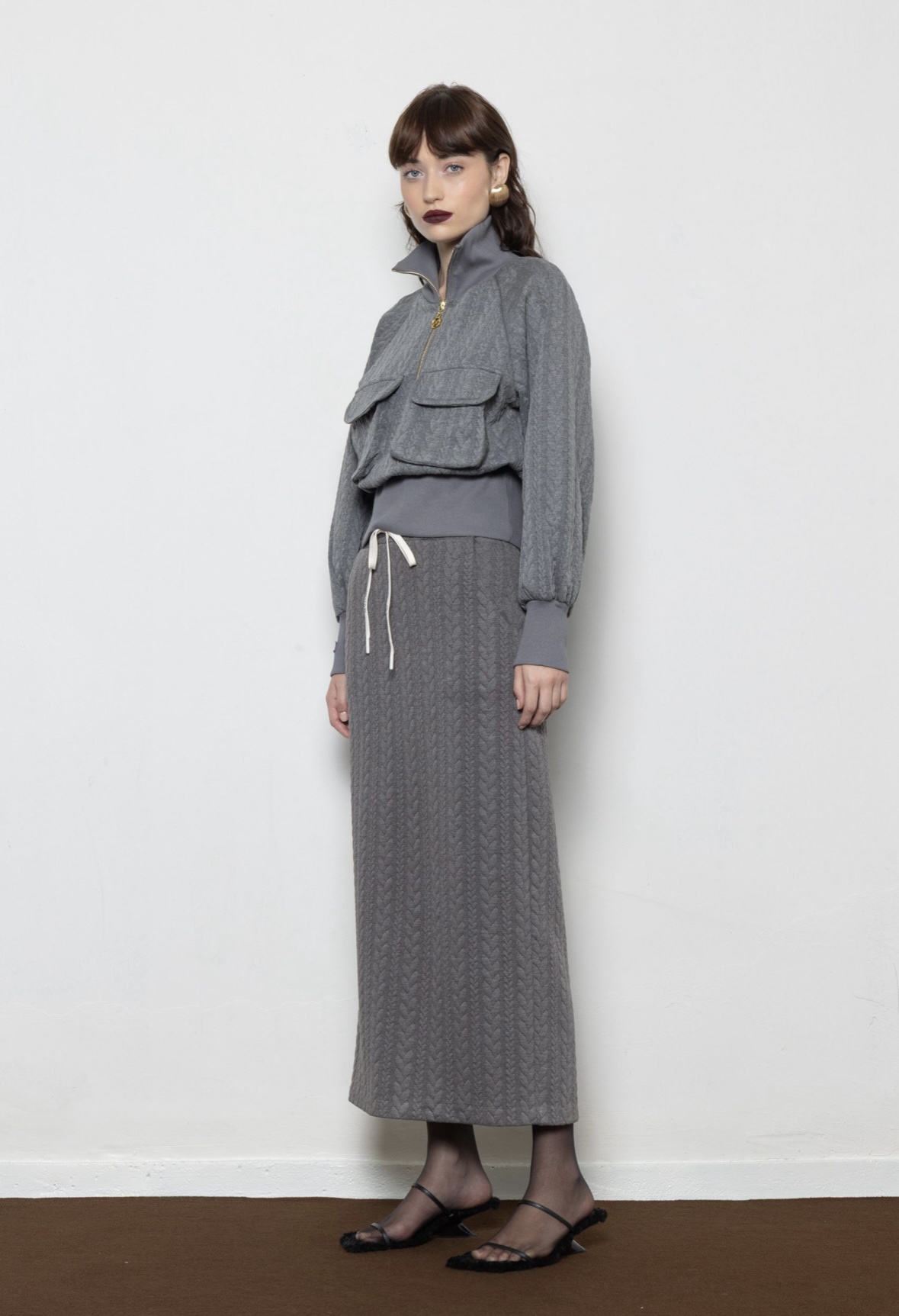 Minimal μάξι φούστα σε γκρι απόχρωση με λάστιχο και κορδόνι στη μέση, καθώς και πρακτικές πλαϊνές τσέπες. Ο συνδυασμός της χαλαρής γραμμής με τη ραφιναρισμένη υφή την καθιστά ένα διαχρονικό και ευέλικτο κομμάτι που μπορεί να φορεθεί από το πρωί έως το βράδυ.