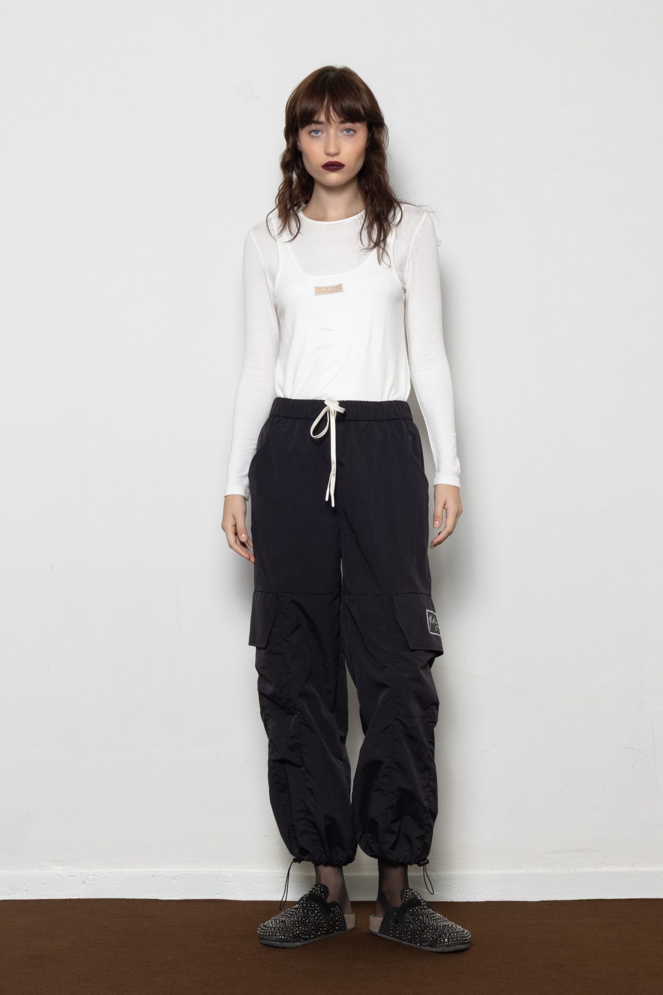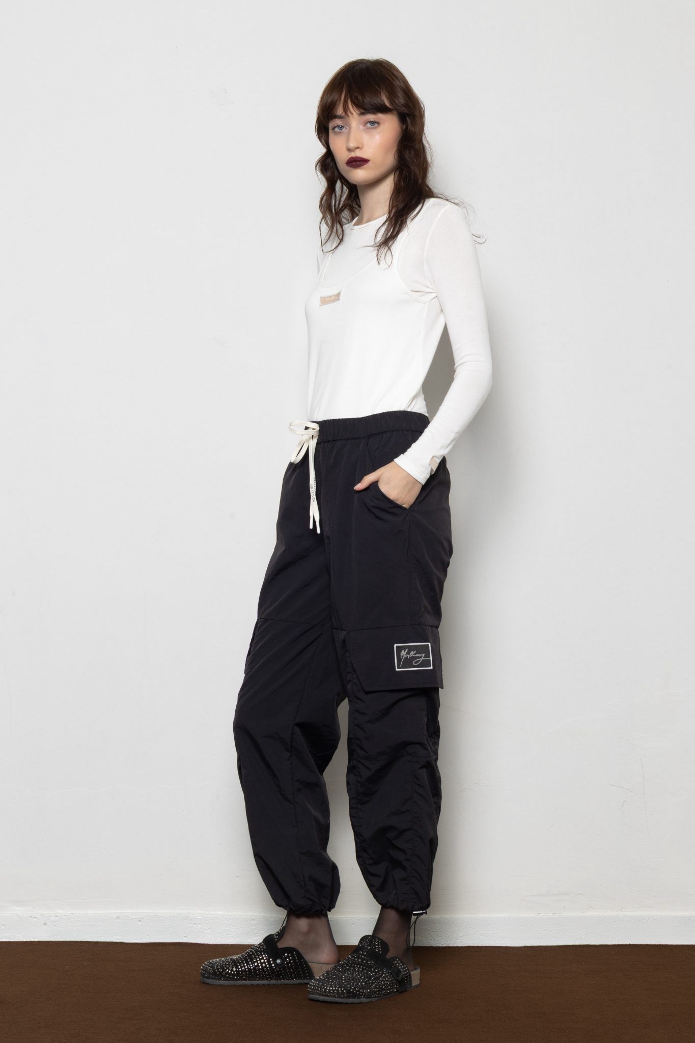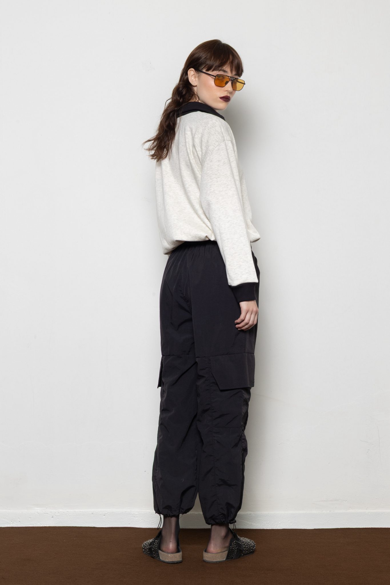 Άνεση σε κίνηση. Αυτό το μαύρο παντελόνι τύπου parachute συνδυάζει χαλαρή γραμμή με εκλεπτυσμένο μινιμαλισμό — ιδανικό για αργά πρωινά ή βόλτες στην πόλη.