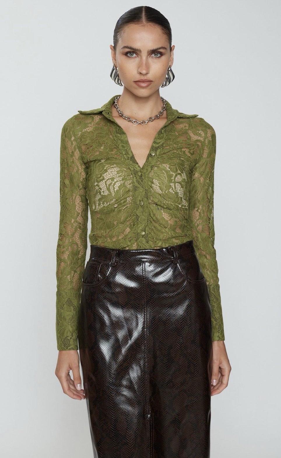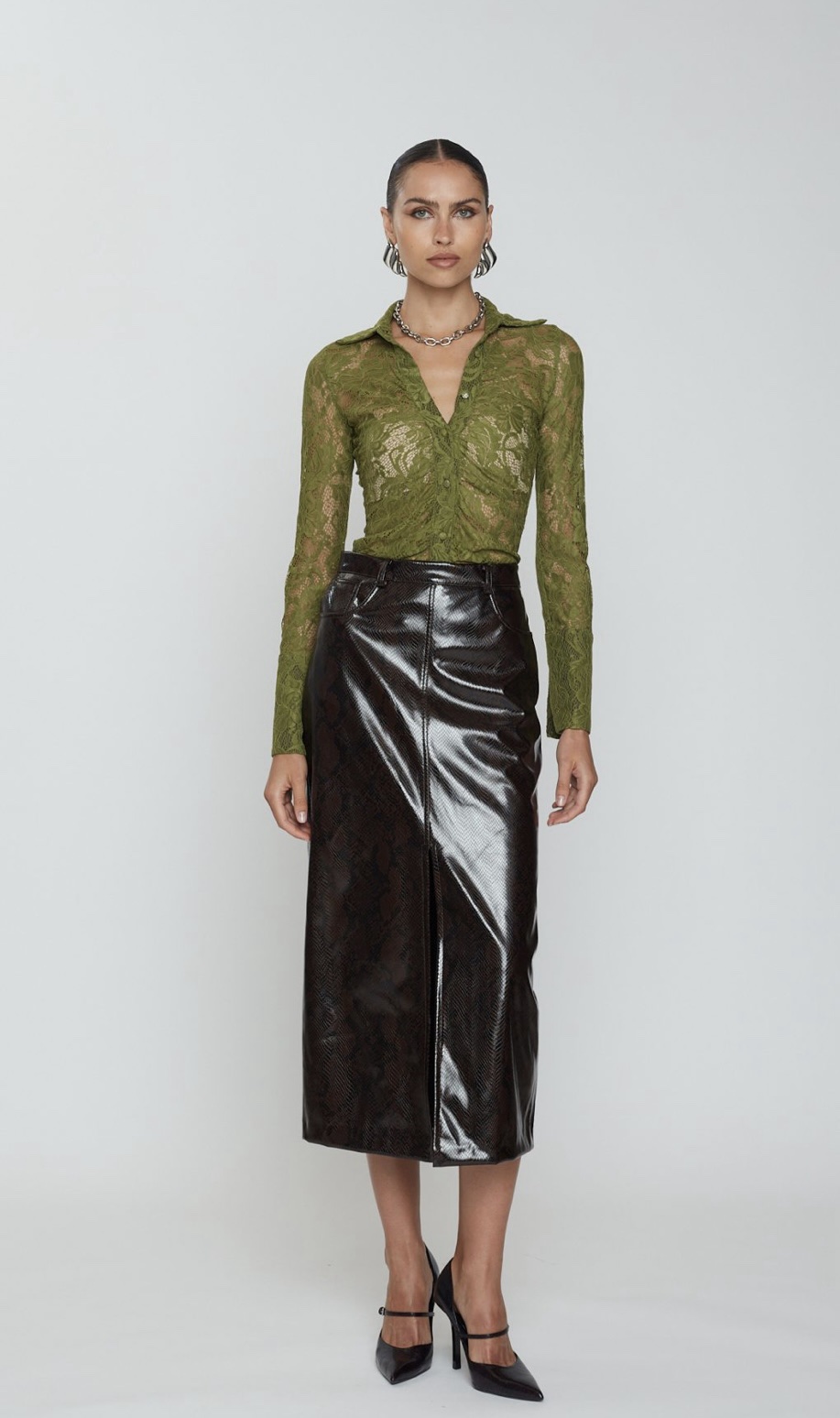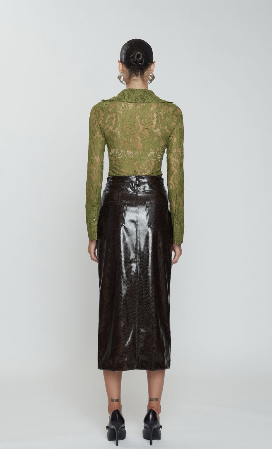 Η Aisha Midi Skirt αποπνέει δυναμισμό και αισθησιασμό, συνδυάζοντας τη λάμψη του faux leather με το διαχρονικό python print. Με ψηλή μέση και εφαρμοστή γραμμή, αγκαλιάζει το σώμα τονίζοντας τη γυναικεία σιλουέτα, ενώ το μπροστινό άνοιγμα χαρίζει άνεση και κίνηση. Ένα statement κομμάτι που μπορεί να μεταμορφώσει κάθε outfit — από ένα τολμηρό βραδινό look μέχρι ένα σύγχρονο city chic σύνολο.