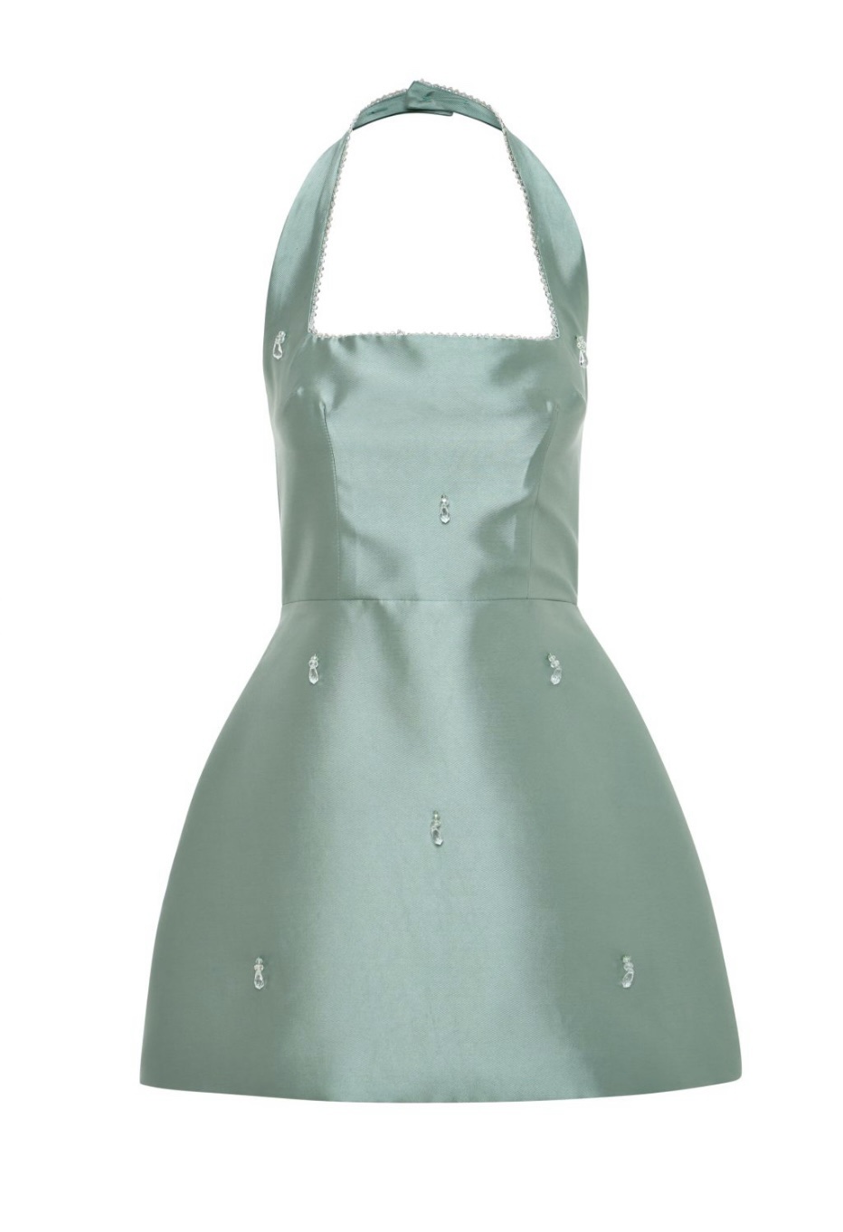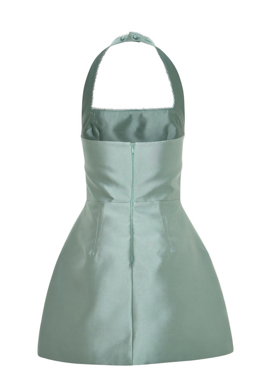 Mini φόρεμα με structured γραμμή που αναδεικνύει τη σιλουέτα με κομψότητα και δυναμισμό. Το halterneck σχέδιο αφήνει τους ώμους ακάλυπτους, ενώ η τονισμένη μέση και η ελαφρώς καμπάνα φούστα δημιουργούν ένα απόλυτα θηλυκό αποτέλεσμα. Η υφή ταφτά χαρίζει πολυτελή όψη και σταθερότητα στο σχήμα.