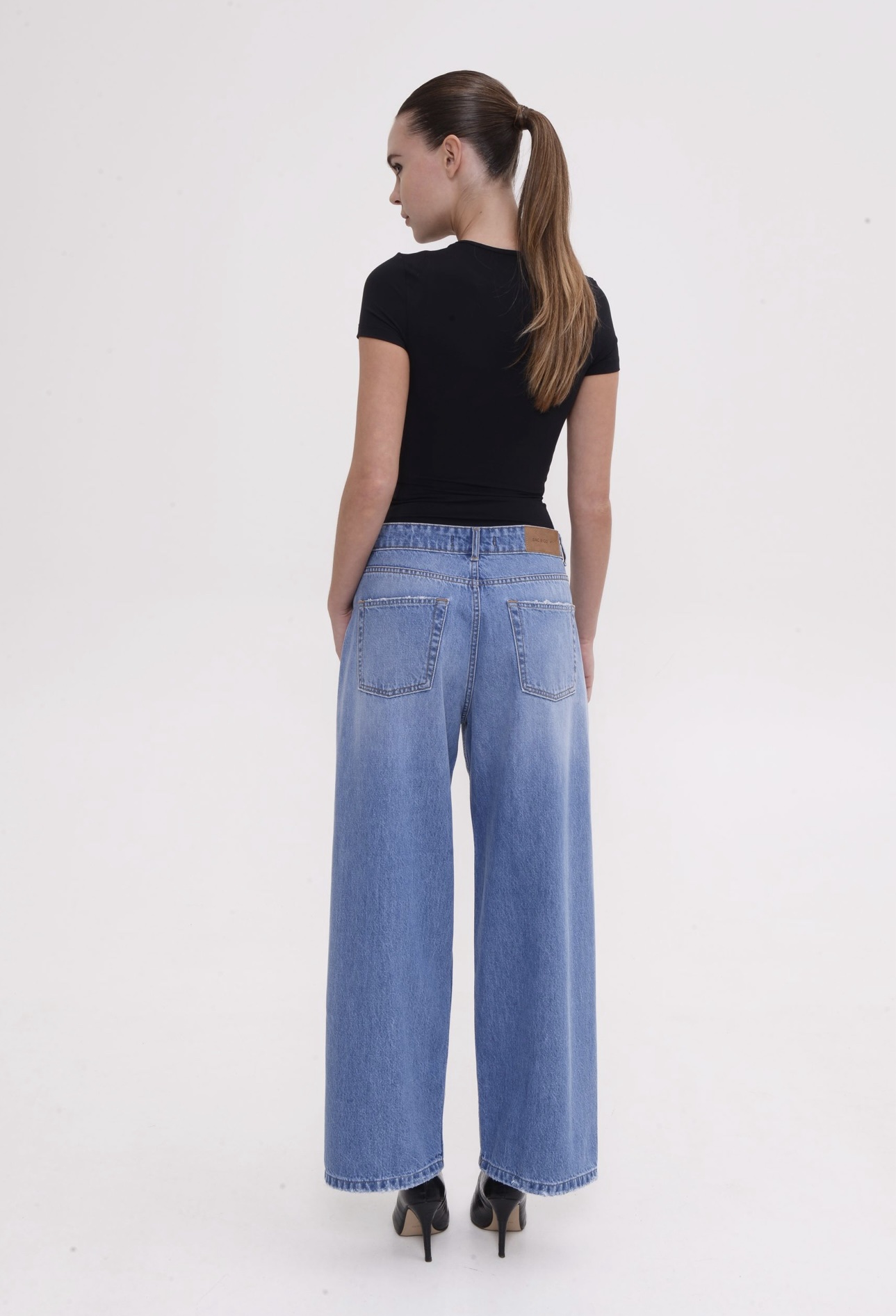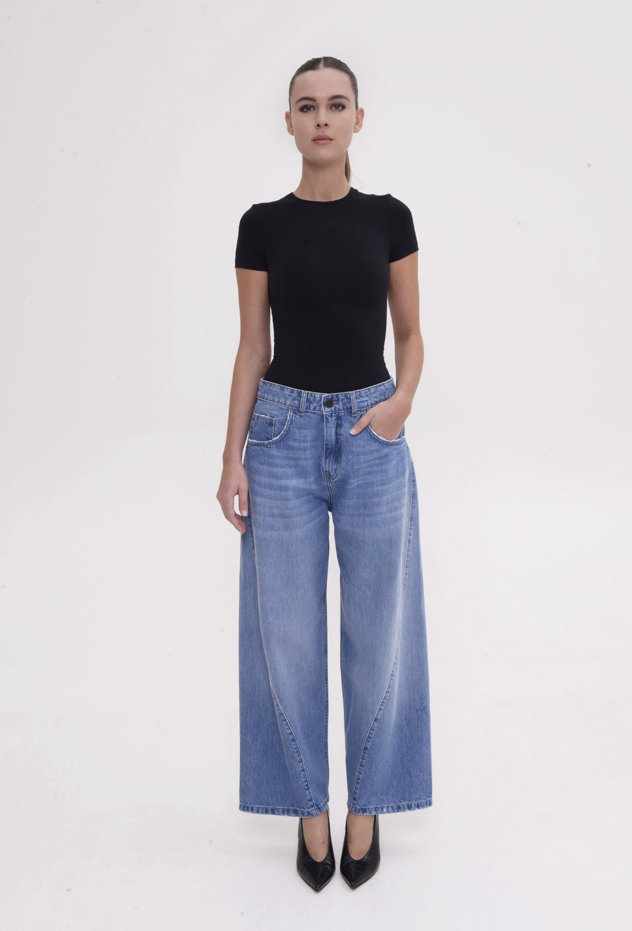 Denim παντελόνι με ιδιαίτερη σχεδιαστική γραμμή που συνδυάζει άνεση και σύγχρονο στυλ. Διαθέτει μοντέρνα barelle / curved γραμμή, με ελαφρώς καμπύλα μπατζάκια που στενεύουν προς τον αστράγαλο, δημιουργώντας ένα πολύ fashion αποτέλεσμα. Το μεσαίο-ανοιχτό μπλε πλύσιμο δίνει casual χαρακτήρα και κάνει το παντελόνι ιδανικό για καθημερινά αλλά και πιο stylish looks.