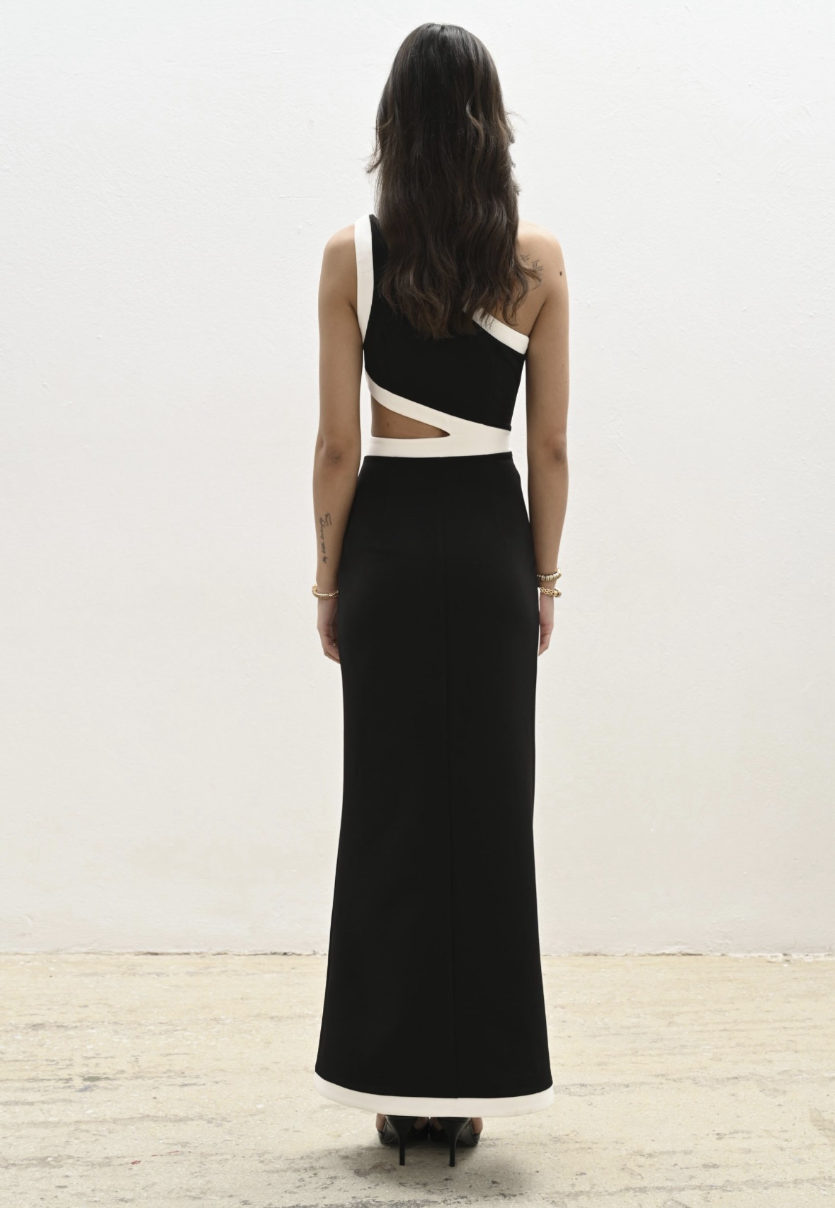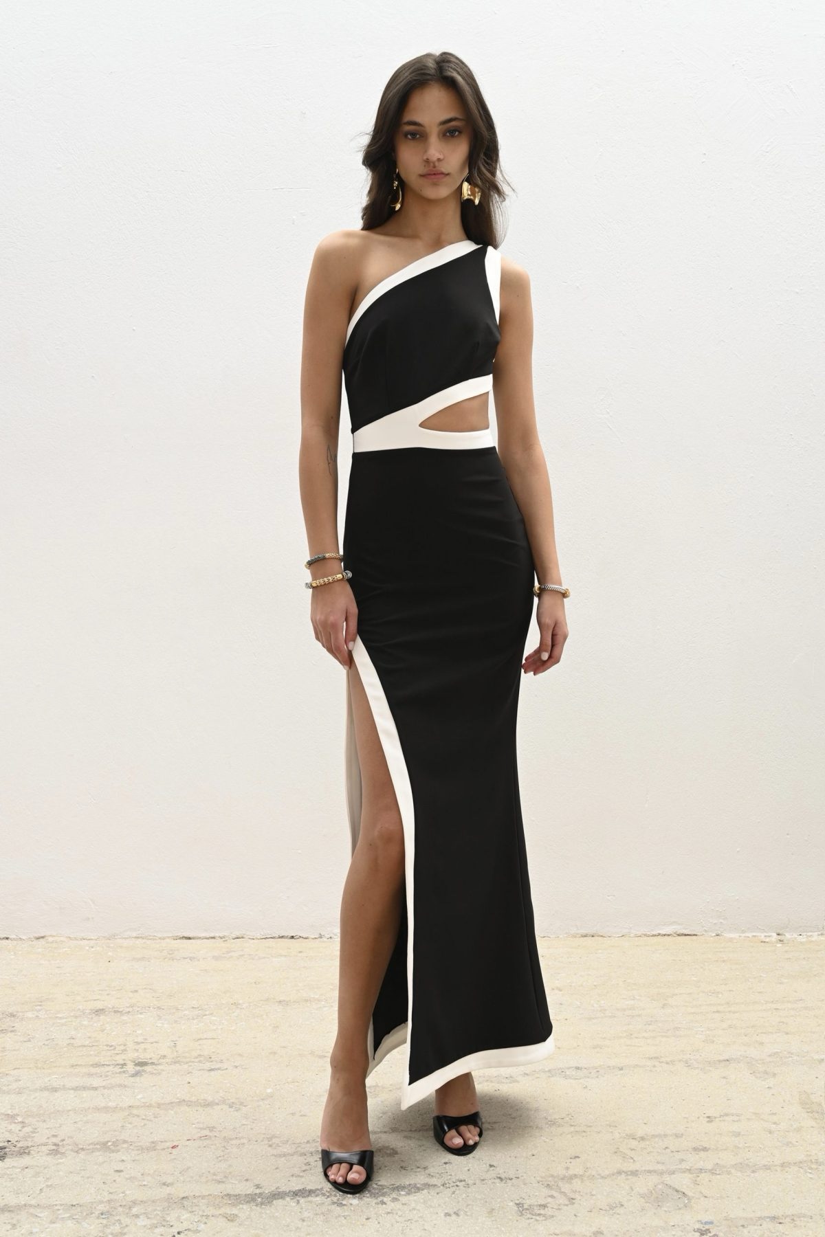 Η one-shoulder γραμμή και το διακριτικό cut-out στη μέση προσθέτουν θηλυκότητα και μοντέρνο χαρακτήρα, ενώ το ψηλό σκίσιμο χαρίζει κίνηση και extra elegance σε κάθε βήμα. Η εφαρμοστή γραμμή αγκαλιάζει το σώμα, δημιουργώντας ένα sleek και refined αποτέλεσμα.