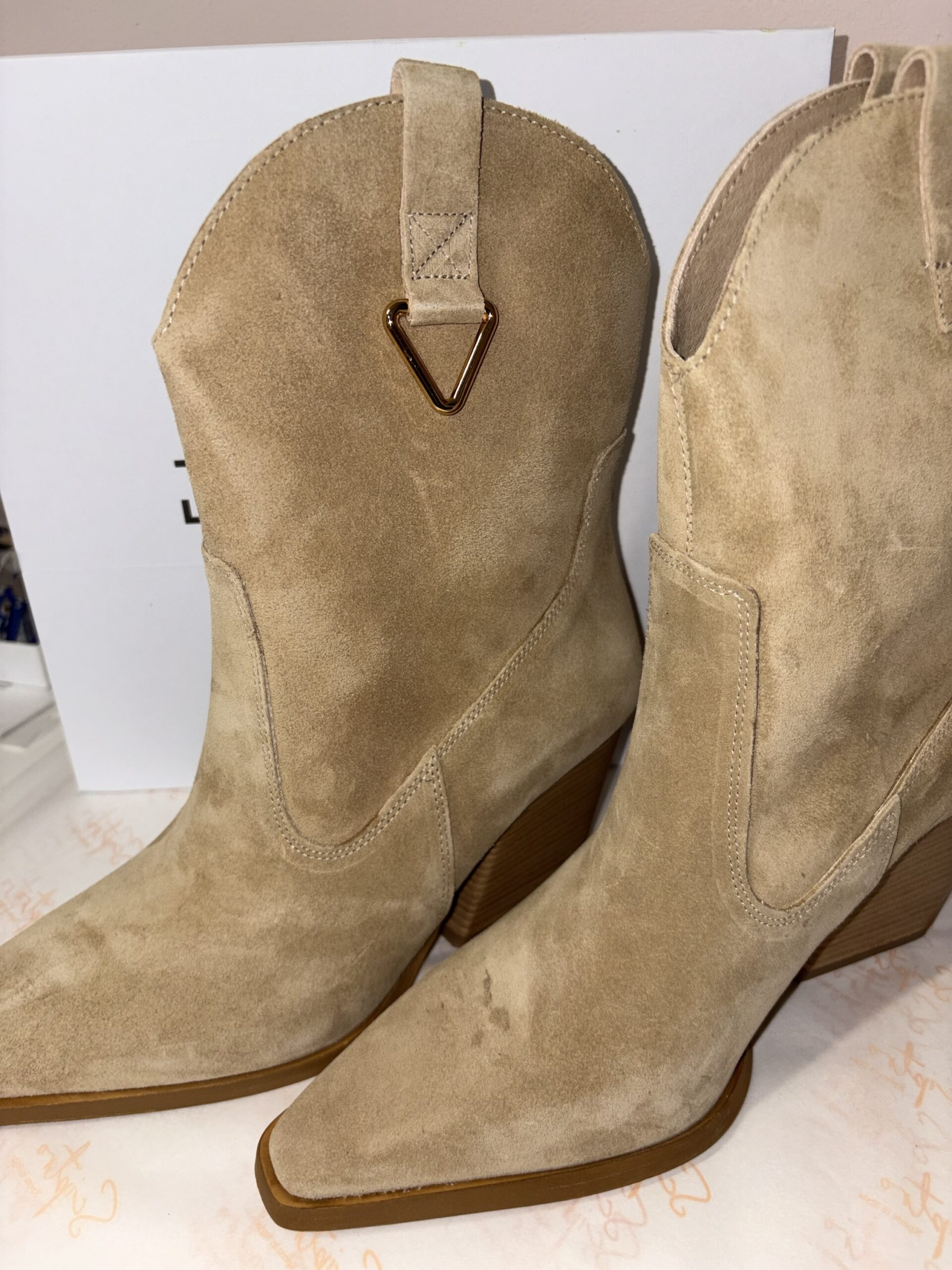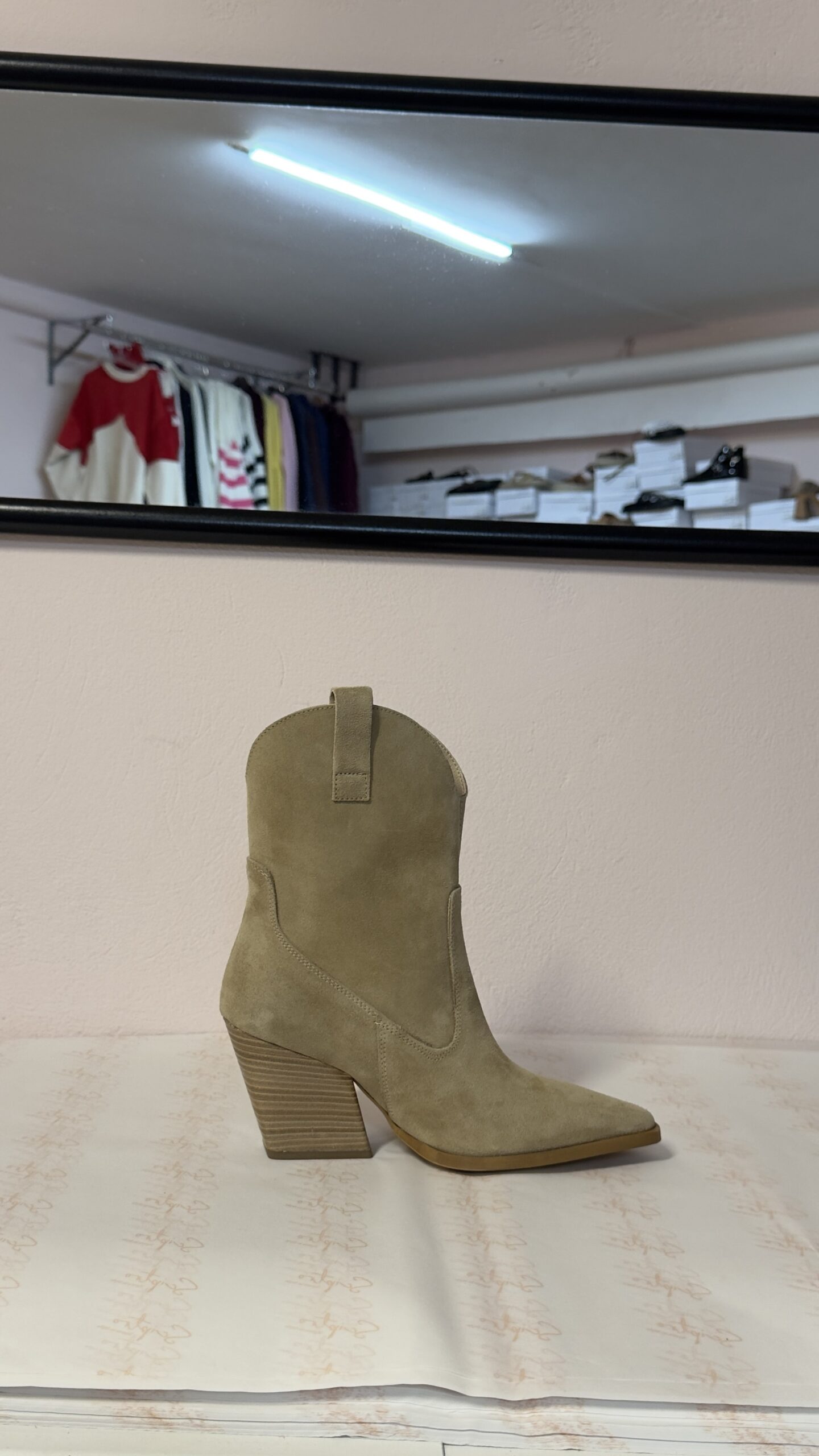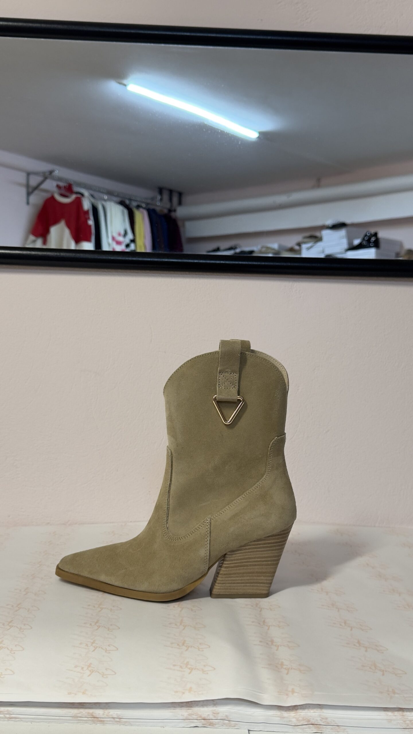 Statement μποτάκια που συνδυάζουν western αισθητική με σύγχρονη κομψότητα! Σε υπέροχη μπεζ suede απόχρωση, αυτά τα ankle cowboy boots είναι το απόλυτο must-have για stylish εμφανίσεις από το πρωί μέχρι το βράδυ.