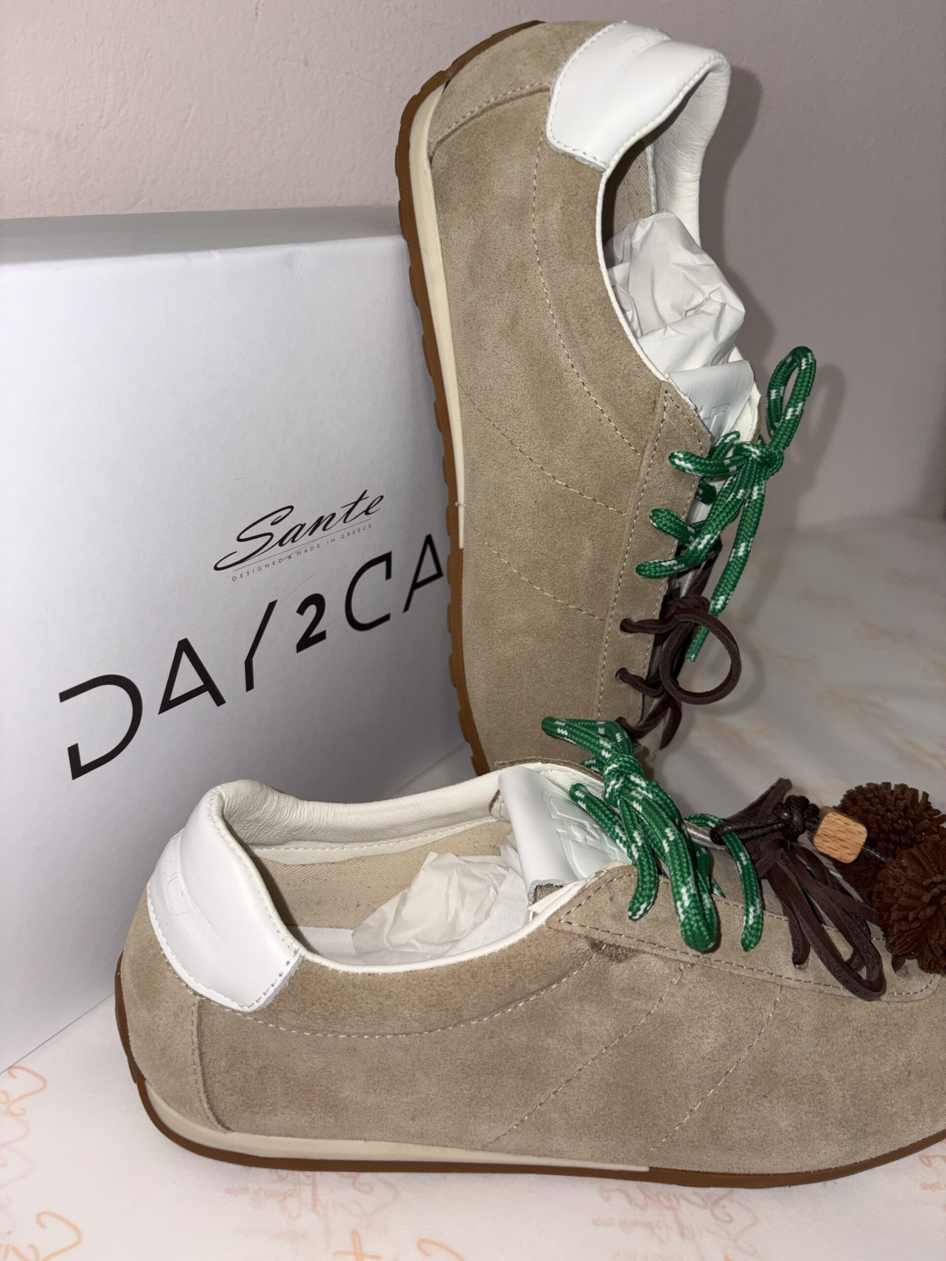 Μοναδικά sneakers που ξεχωρίζουν από την πρώτη ματιά! Σε υπέροχη μπεζ suede απόχρωση με λευκές λεπτομέρειες, αυτά τα παπούτσια συνδυάζουν άνεση και στιλ με τον πιο fashionable τρόπο. Το ιδιαίτερο design με τα διπλά κορδόνια σε πράσινο και καφέ χρώμα δίνει χαρακτήρα, ενώ οι διακοσμητικές pom pom λεπτομέρειες χαρίζουν playful αλλά chic αισθητική.