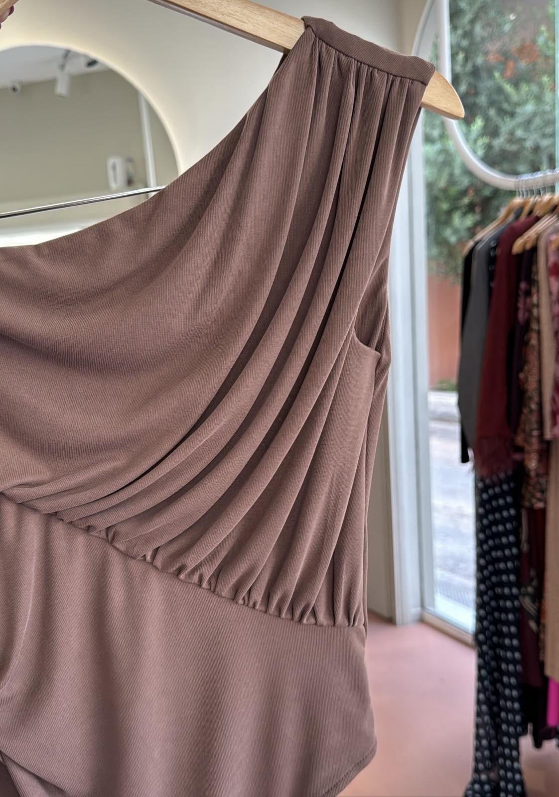 Το Adele Bodysuit είναι το απόλυτο κομμάτι για μια κομψή και σικ εμφάνιση. Η ασύμμετρη γραμμή με τις ντραπέ πιέτες στον έναν ώμο χαρίζει θηλυκότητα και διακριτική πολυτέλεια, ενώ η εφαρμογή του αγκαλιάζει όμορφα το σώμα.